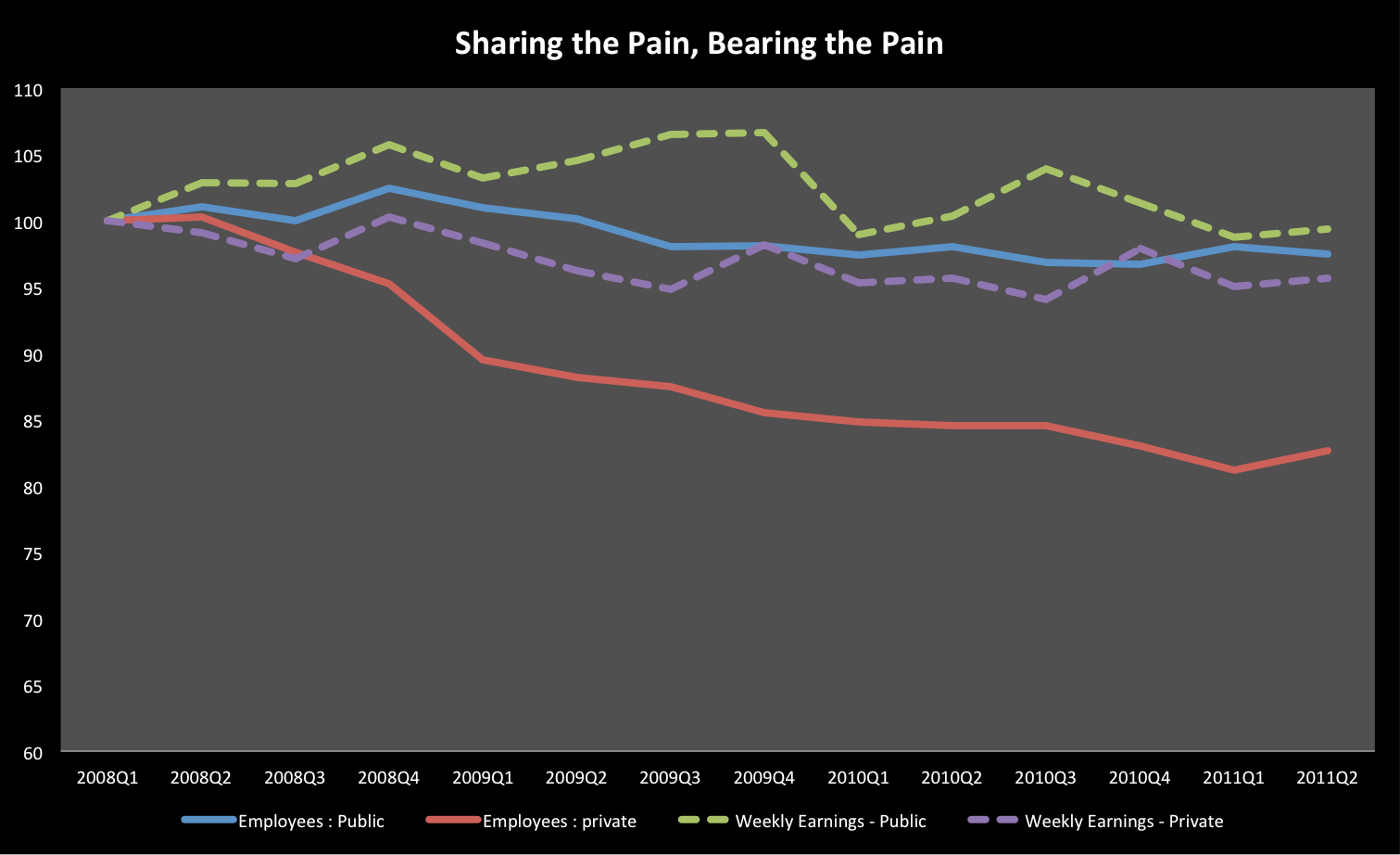 I spoke recently to a representative of the first/third group, who urged me to brace for a 40% pay cut “like the private sector has had” via the immenent (wished for?) scrapping of the agreement. Hmmmm. Not quite true… Here is a graph of public/private sector average hourly wages and total employment over the last while. One of the things we want, those of us who dont deem all public servants inherent spongers (or is that the people on welfare? cant ever remember) is that government act to stabilize and smooth out the economic cycle. You dont have to be an unreconstructed keynesian (or even Paul Krugman) to think that smoother cycles are perhaps preferable to more jagged ones.
