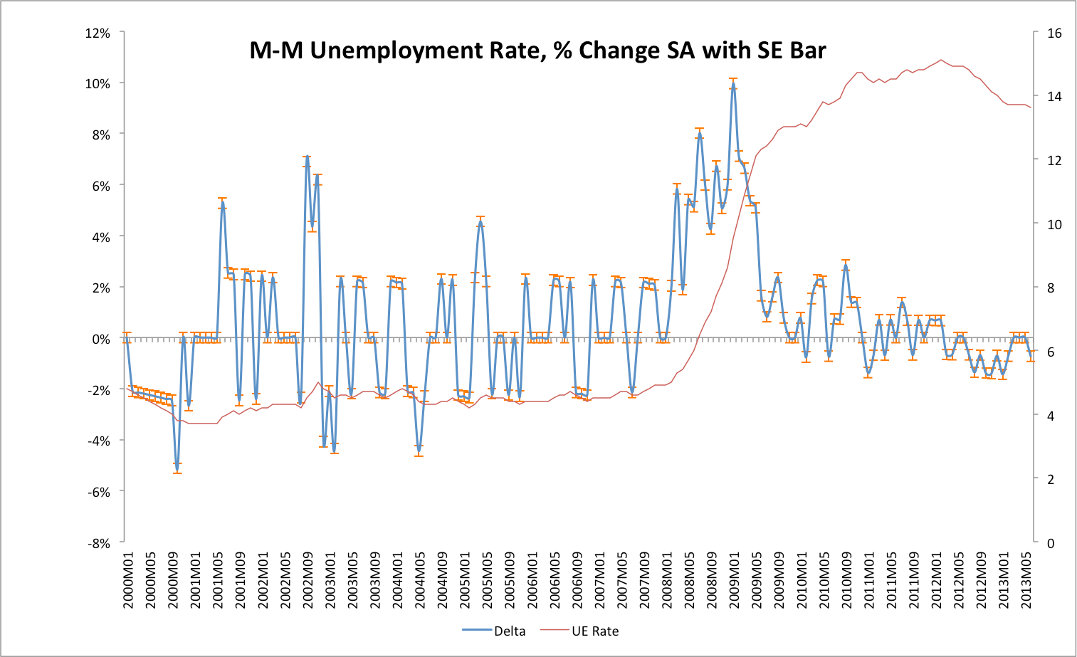 Basic statistics tells us that when a series is volatile there is a chance that it will show a rise and a chance that it will show a fall. There is a chance that it will show no change. We can and we should take into account the volatility of the data when we analyse it, and more to the point the reportage of the data should do so. This doesn’t happen. We will not soon see a headline “GDP rises (but its statistically equal to zero and might actually be a fall) in Quarter 2”. A rise in GDP will be greeted as corner turning stuff no matter how statistically meaningless this is. If we look at the Irish data we see significant volatility. This is best indicated by the standard ‘measure’ of recession, two successive quarters of declining GDP. By that measure we have been in recession four times (and out three times) since 2007. The reality is that it is one long recession. The GDP and GNP data are extremely volatile. GDP quarter to quarter changes are slightly less volatile than GNP, contrary to what many think and despite the GDP data being subject to distortion from the MNC sector. If we look at the quarter to quarter changes we see that they average about 1.4% quarter to quarter. If we look at the data knowing how volatile they are and how much the average change is we can consider some ‘bounds’ within which, statistically, the data should lie. This is called the ‘standard error’ . There are other measures to give these confidence intervals but all are in essence variations on a theme. Using this gives us a sense of whether or not we can be confident that a small rise or fall is in fact one, given the way the data jump about.
