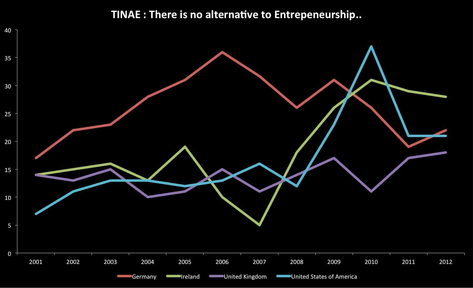 the first looks at the UK USA and Germany vs this fair land. Note that in two cases, 2007 Germany and 2009 Ireland the data were not available and to avoid gaps in the series I interprolated by average. Note especially Germany where there is a noticable rise in the percentage of those involved in setting up businesses as a TINAE after the 2001-3 wave of Hartz reforms, reforms the Irish Government is now eyeing as exemplars.