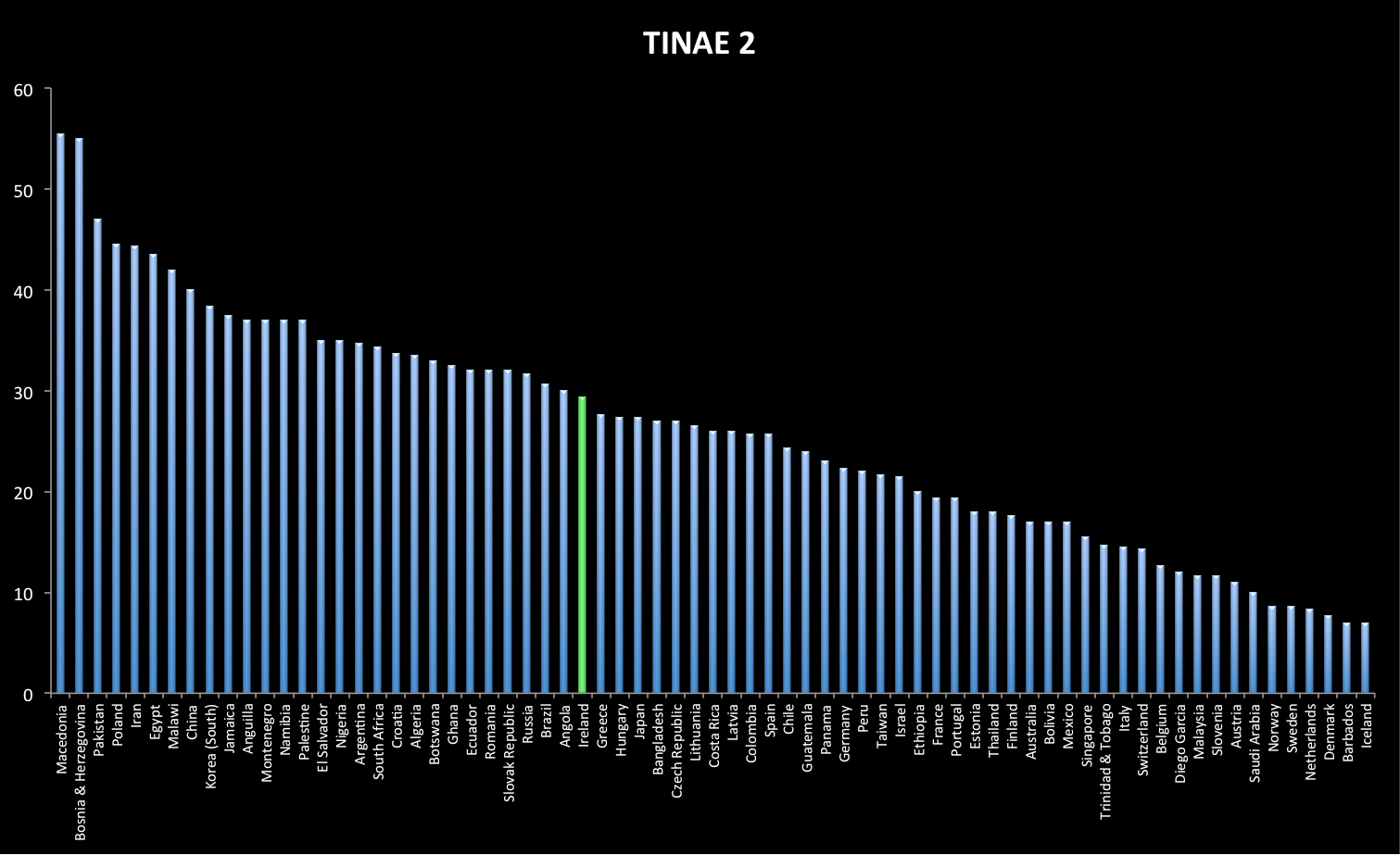 But maybe this is not a problem? Maybe in reality its the big countries that are outliers, and smaller/poorer states such as we are becoming are better benchmarks. Lets see. The chart below shows this data averaged across the last three survey periods (2012-11-10) for all countries which participate. The median rate of TINAE is 26%. Ireland is at 29%. The only other EU states above Ireland are Romania, Slovakia and Croatia.