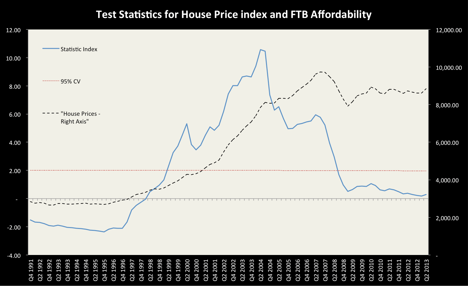 Below see two graphs. The first is the UK housing market, defined as the Nationwide All homes index. Overlaid is the Nationwide First Time Buyer Affordability index. The second is the test statistic which indicates a bubble starting in md 1999 and terminating in late 2008. While there is a slight uptick in the statistic for q2003 it is still well below its critical value and has been on a downward trend. This suggests, no more, that at present there is not a bubble; it does not suggest that vigilance is not needed.