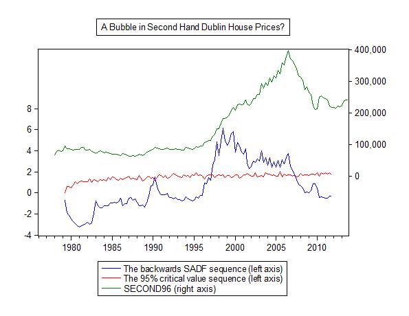 A newly developed statistical technique (see here and here for previous posts using it to talk about bubbles in London and Bitcoin) has, it is claimed, good power to detect bubbles. Below see the results for real dublin house prices, 1996 prices, for new and second hand homes.